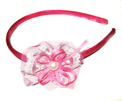 Plastic headband wrapped into fabric with satin flower and pearl